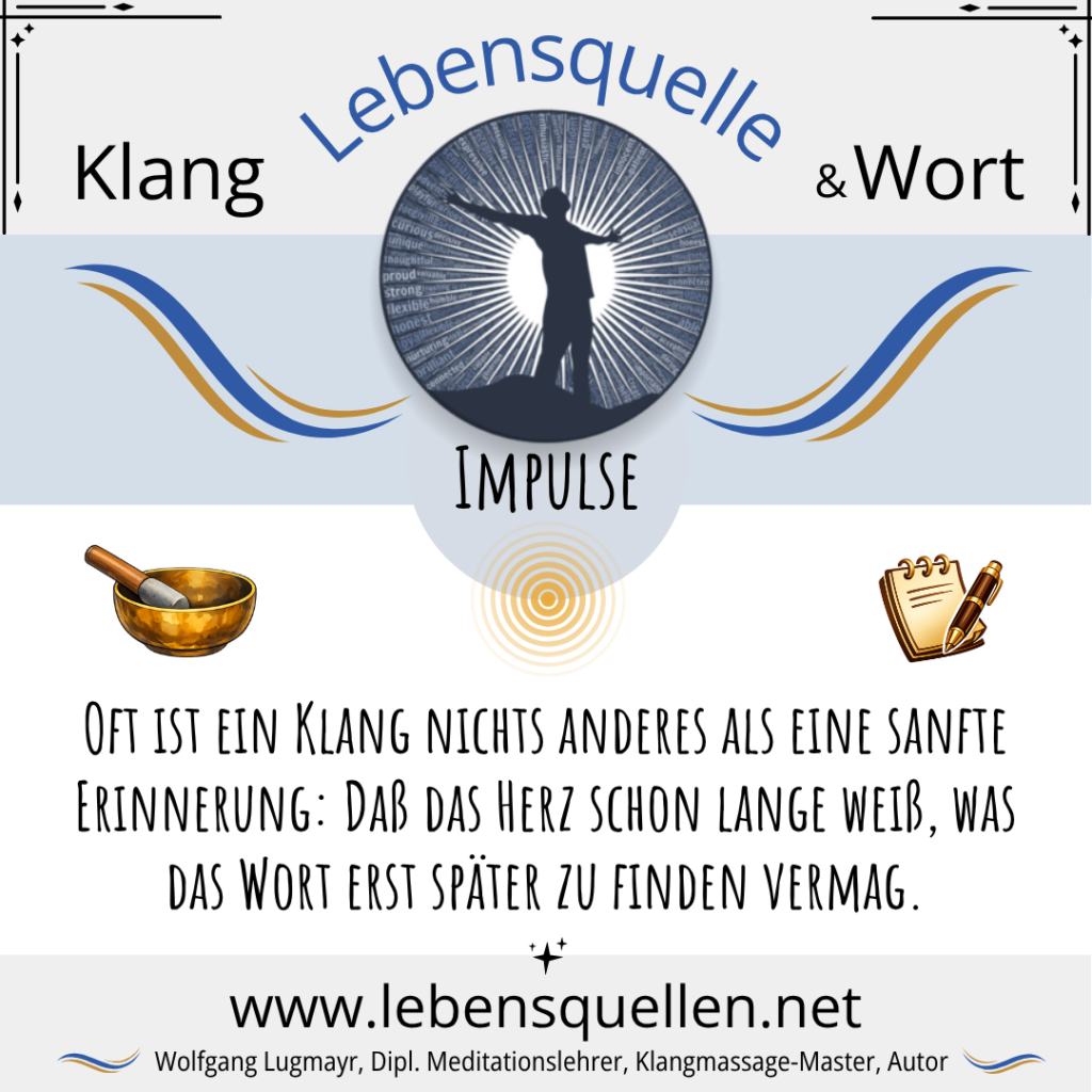 Dazu kommt mein Tun mit den Klangschalen („Lebensquelle Klang„), die ich mit dem Wort kombiniere (siehe weiter unten). Denn Worte und Klang sind keine getrennten Welten — sie sind zwei Ausdrucksformen derselben inneren Bewegung. Drei zentrale Verbindungen zeigen sich dabei deutlich: